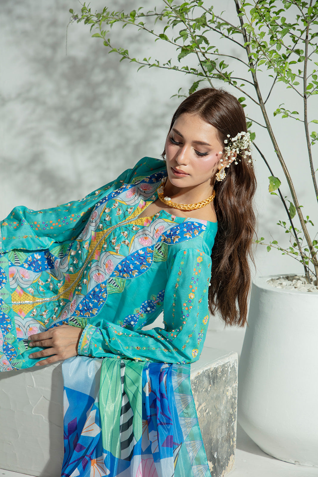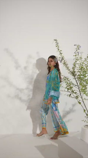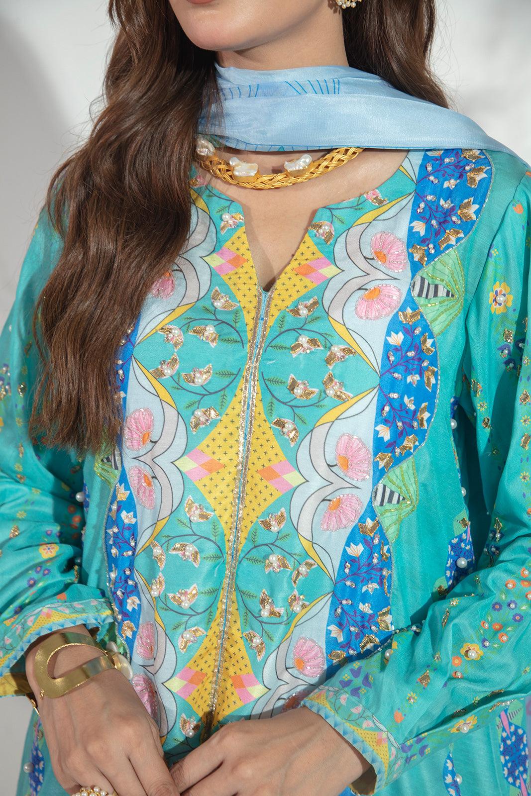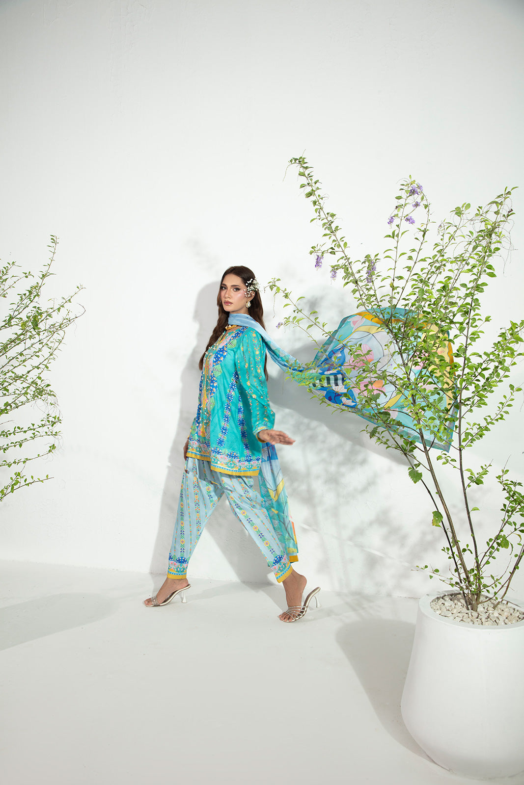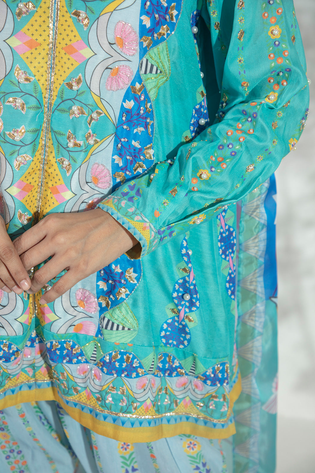 A chic play on tradition, this ensemble features a fitted paoncha cambric shalwar paired with a short lawn shirt and graceful full sleeves. The look is brought to life with exquisite hand embellishments on the front and sleeves, including kora, dabka, gota, pearls, and cutdana, adding delicate sparkle and timeless charm. Completing the outfit is a silk dupatta, finished with a classic gota border, making it the perfect blend of elegance and heritage.