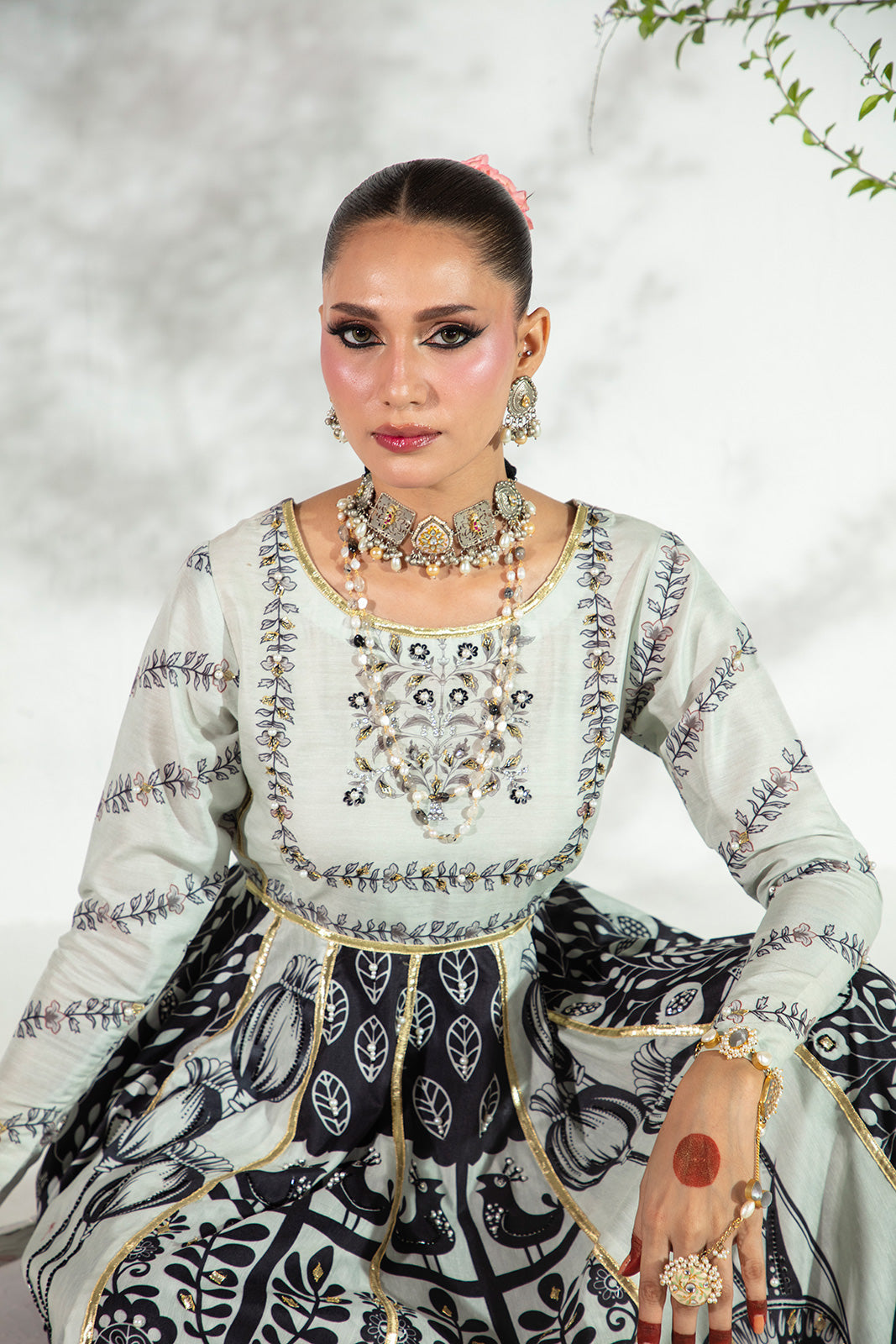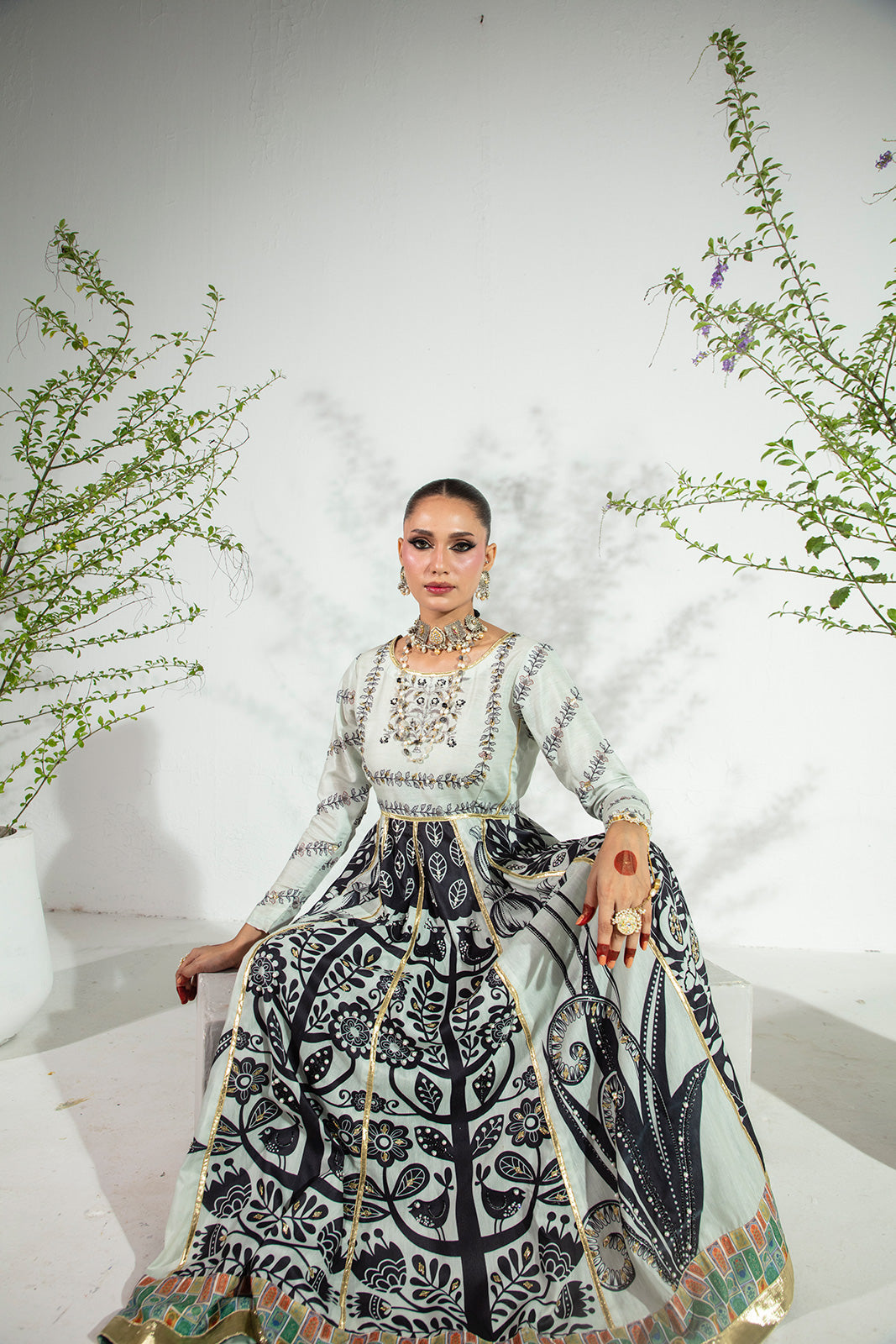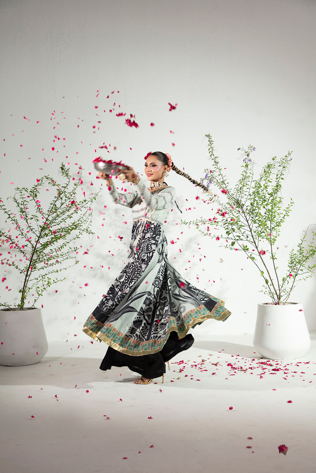 A charming 12-kali cotton frock that effortlessly blends tradition and playful elegance. The frock is hand-embellished on the front and sleeves with gota, sequins, cutdana, and pearls, adding delicate sparkle to its graceful silhouette. Styled with a solid black cigarette pant and a silk dupatta, this ensemble is perfect for festive occasions, daytime celebrations, or elegant gatherings.
