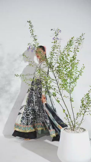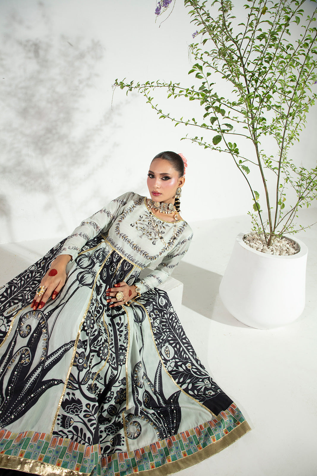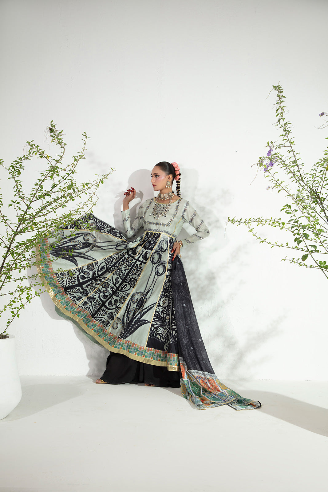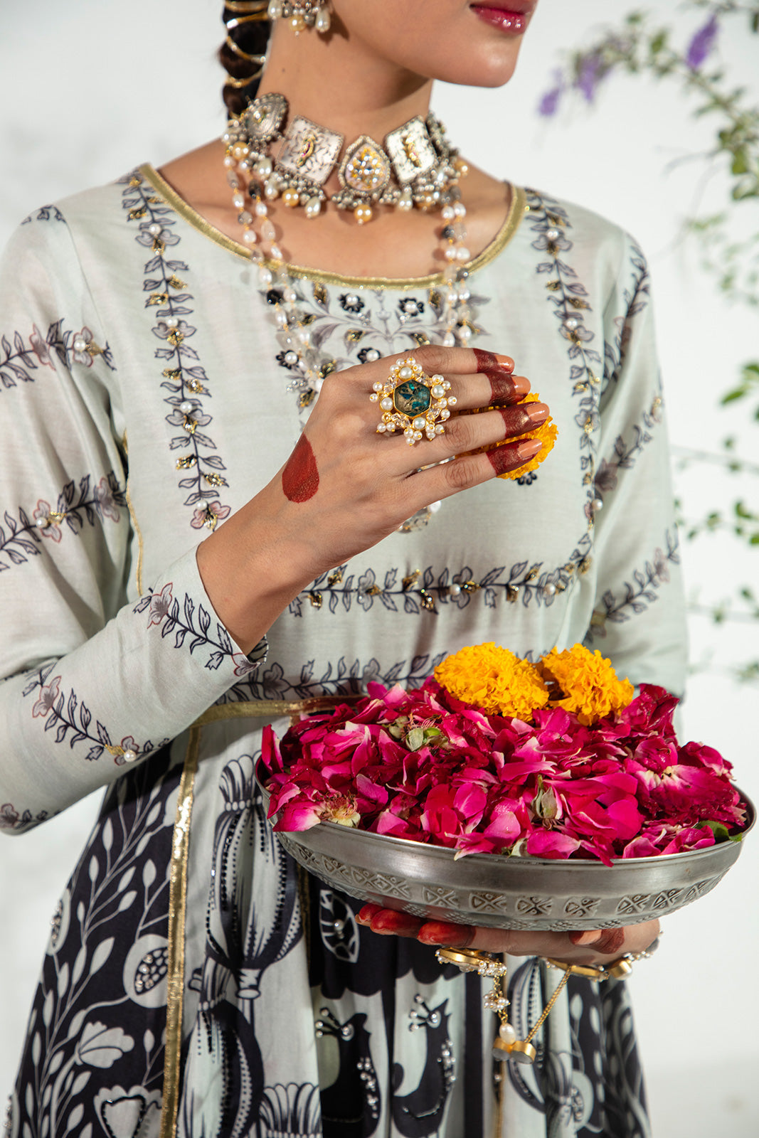 A charming 12-kali cotton frock that effortlessly blends tradition and playful elegance. The frock is hand-embellished on the front and sleeves with gota, sequins, cutdana, and pearls, adding delicate sparkle to its graceful silhouette. Styled with a solid black cigarette pant and a silk dupatta, this ensemble is perfect for festive occasions, daytime celebrations, or elegant gatherings.