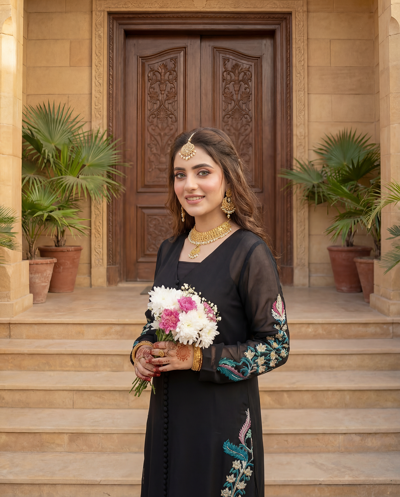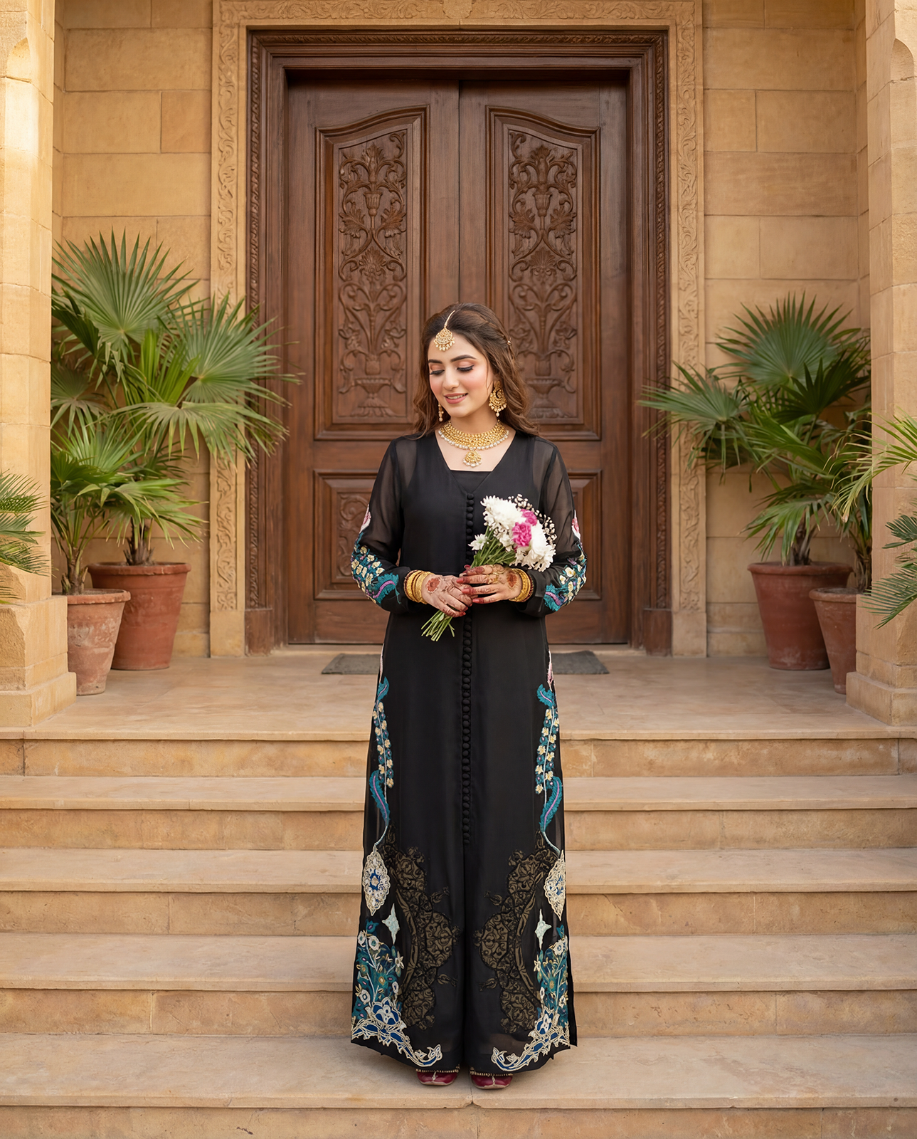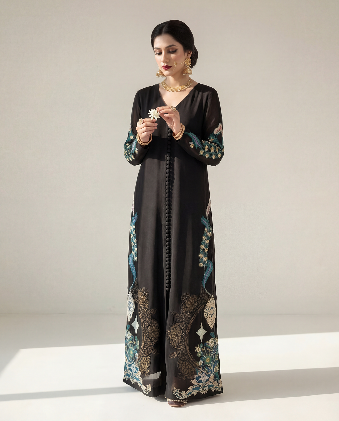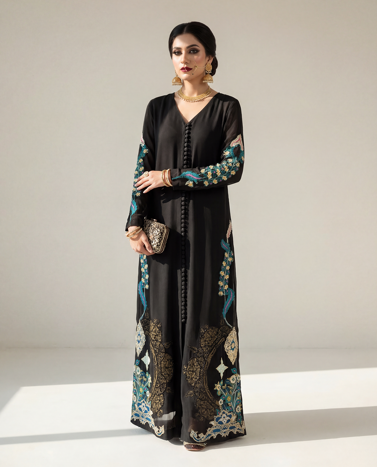 A luxurious black kaftan, exquisitely embroidered and hand-embellished with pearls, sequins, and crystals, offering a graceful and glamorous silhouette perfect for evening and festive occasions.