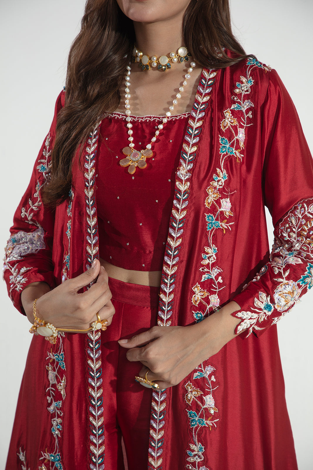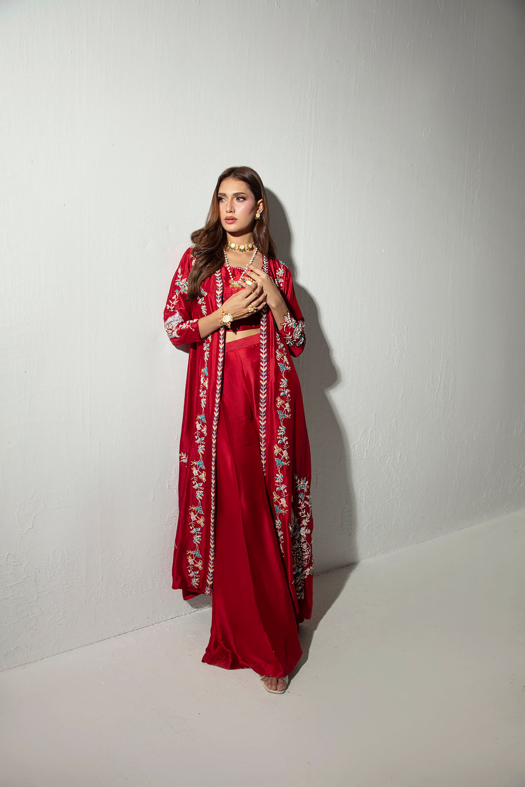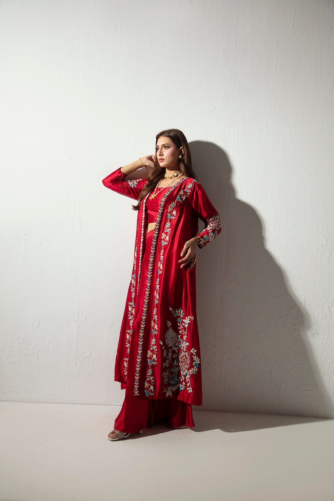 A sophisticated three-piece ensemble crafted in lustrous Sheesha silk, featuring a long coat that takes center stage with intricate embroidery and refined hand embellishments, adding depth and artisanal charm. Paired with a sleek, coordinated blouse and tailored pants, this design offers a graceful balance of modern structure and timeless elegance, perfect for elevated festive and formal occasions.