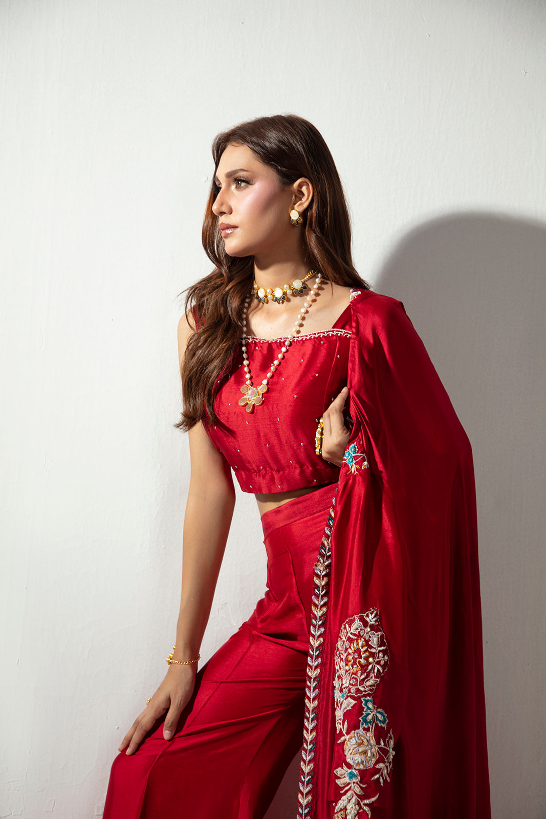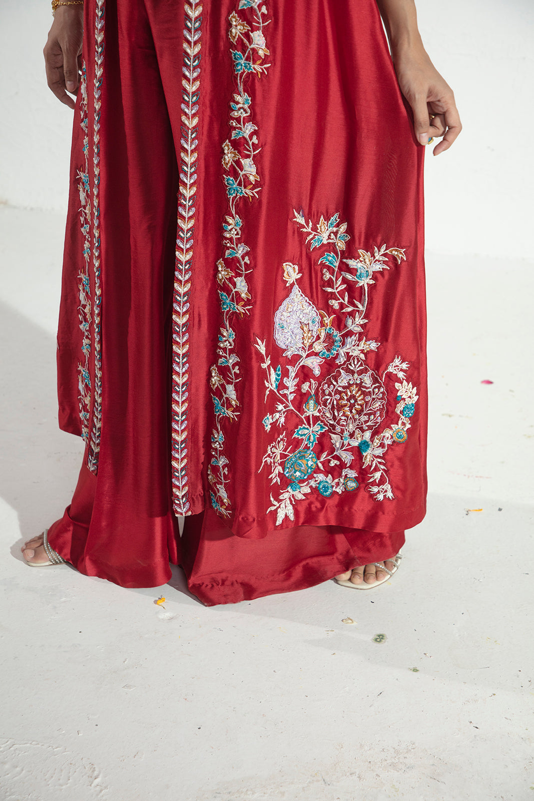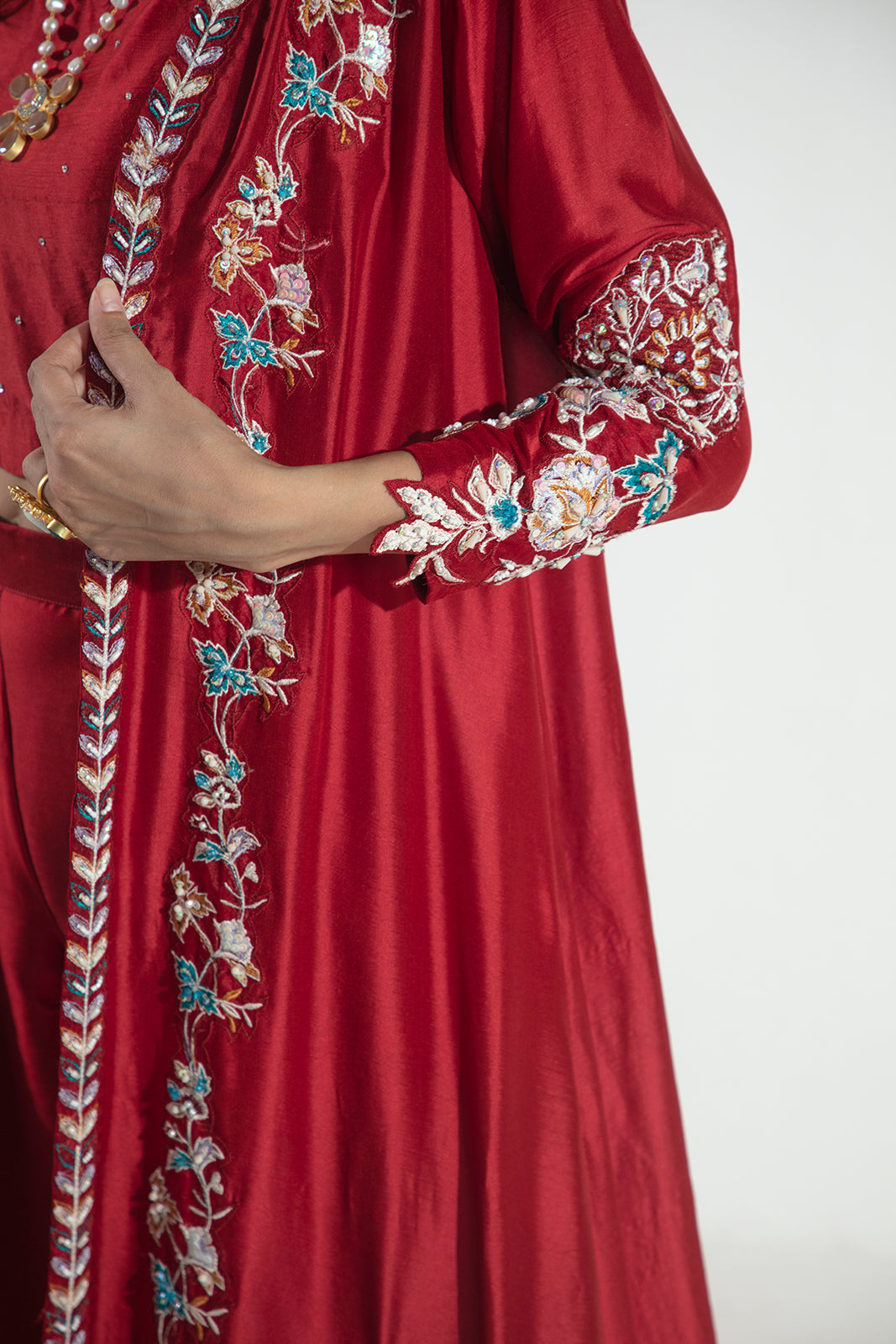 A sophisticated three-piece ensemble crafted in lustrous Sheesha silk, featuring a long coat that takes center stage with intricate embroidery and refined hand embellishments, adding depth and artisanal charm. Paired with a sleek, coordinated blouse and tailored pants, this design offers a graceful balance of modern structure and timeless elegance, perfect for elevated festive and formal occasions.