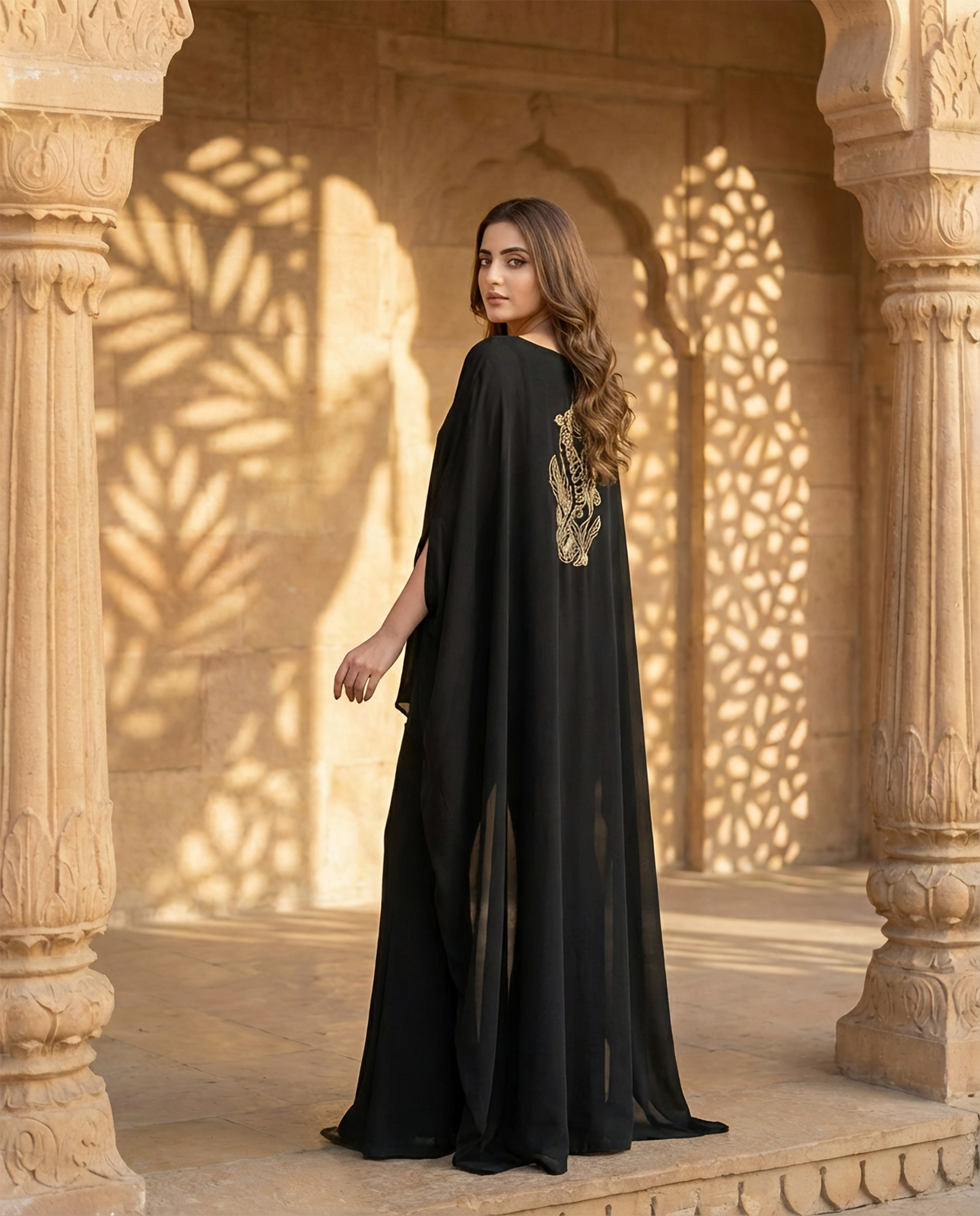 A striking black ensemble featuring a poncho-style top paired with bell-bottom pants, adorned with hand-embellished motifs on the front corners and back, creating a bold yet elegant silhouette perfect for festive and evening occasions.