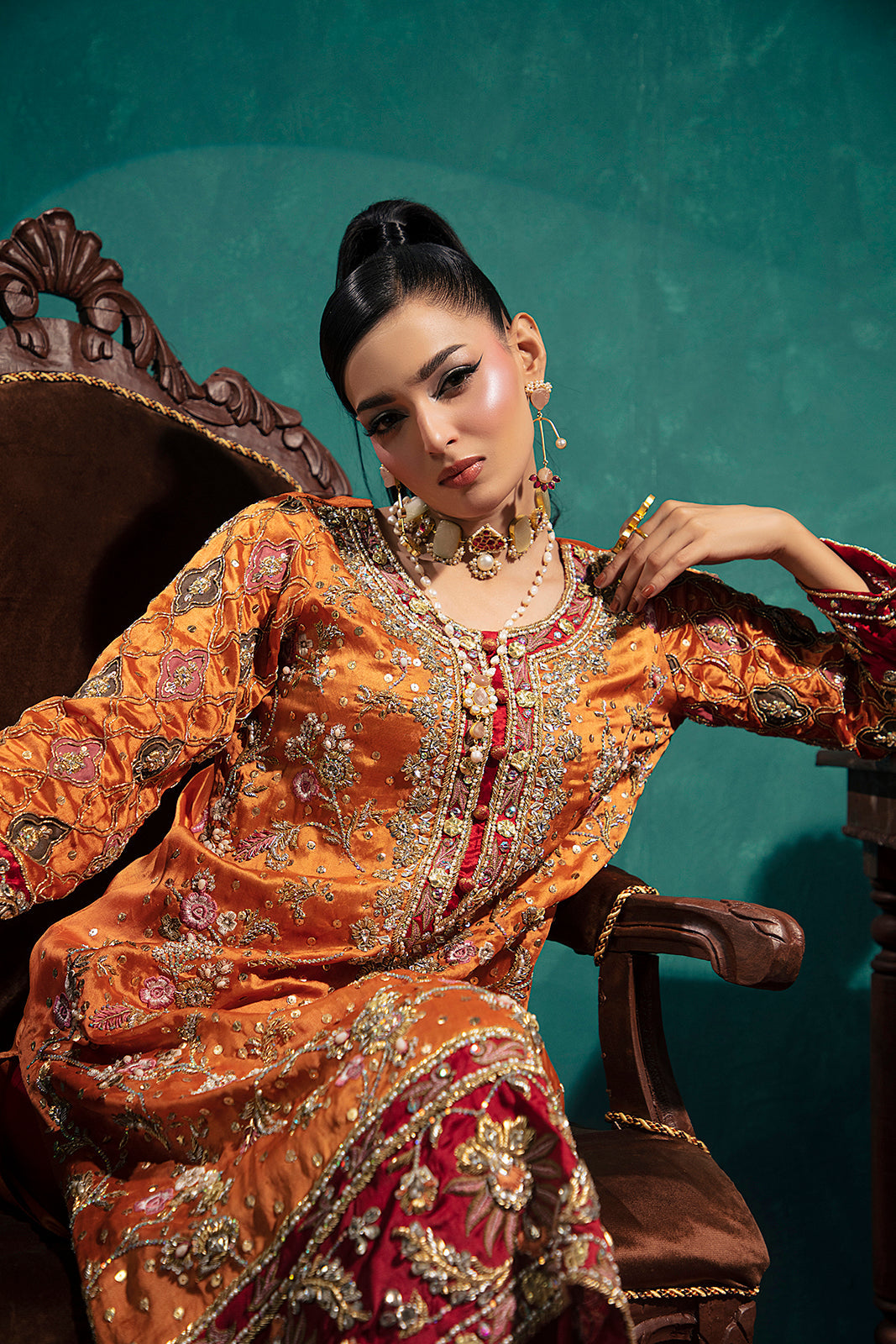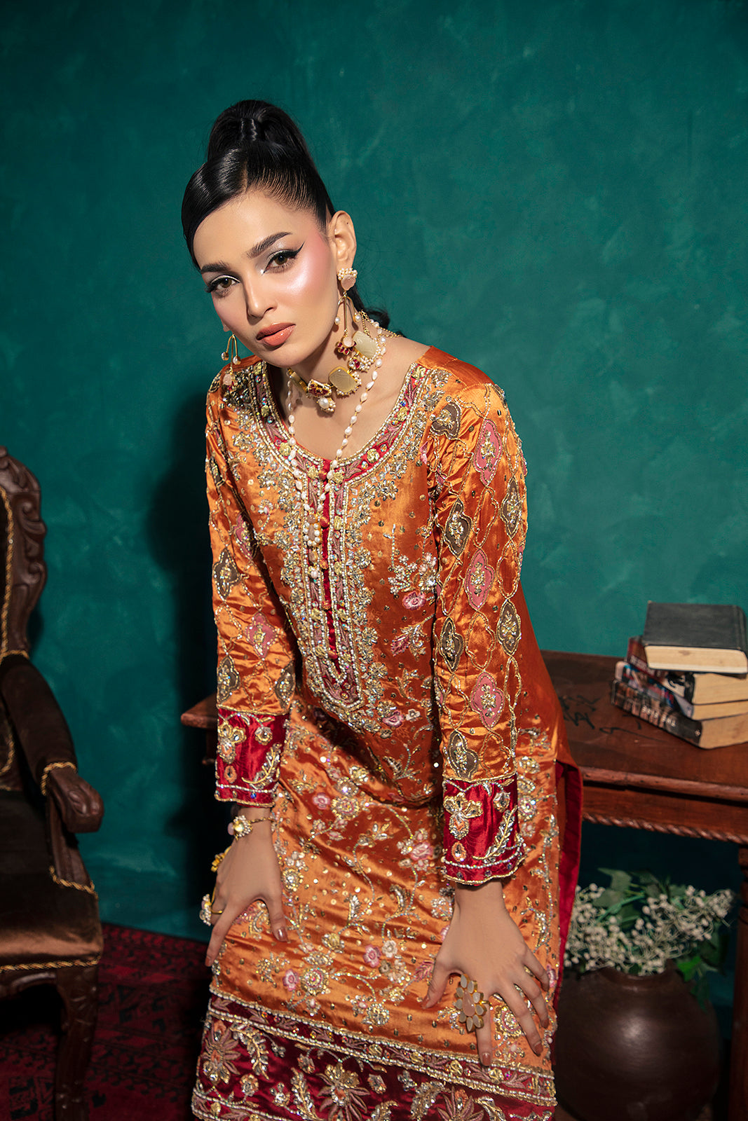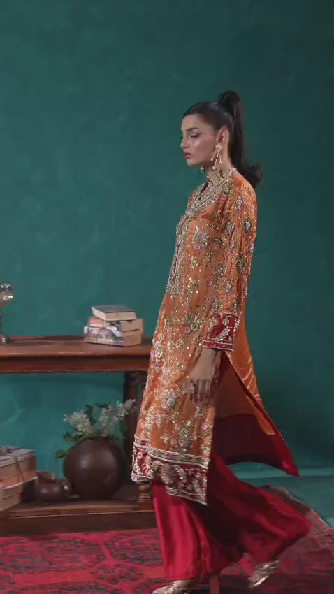 A luxurious three-piece ensemble featuring intricate handwork adorning the front and sleeves in fine artisanal detail. The shirt and trousers are crafted from lustrous sheesha silk, offering a rich, fluid drape. The look is completed with a graceful chan boti dupatta, adding softness, texture, and timeless elegance to the overall silhouette.