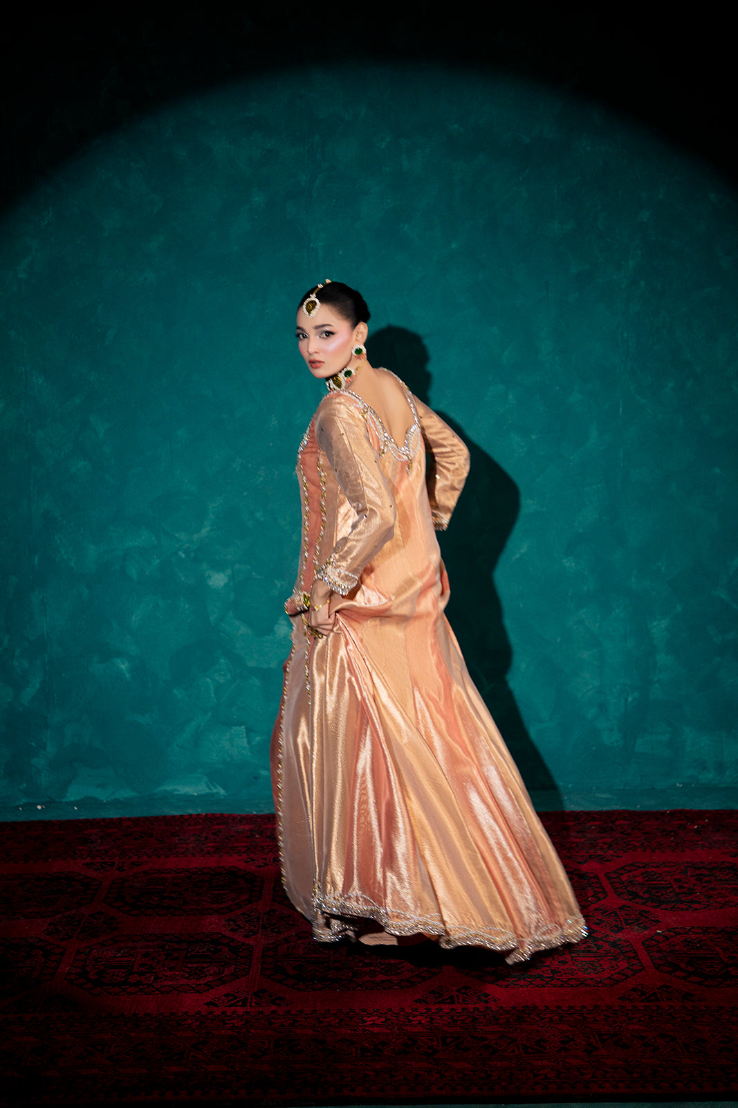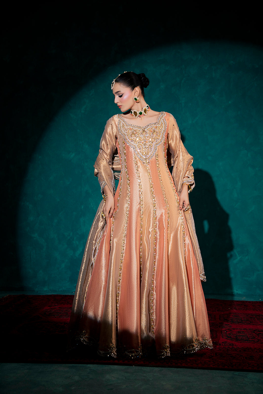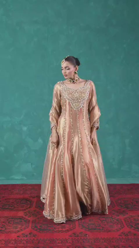 This ethereal shimmer organza kali frock is paired with a matching shimmer organza dupatta. The frock features intricate handwork across the front, sleeves, back neckline, and hem, embellished with crystals, kora, and dabka. The dupatta is finished with a delicately hand-embroidered border, completing this elegant and sophisticated ensemble.