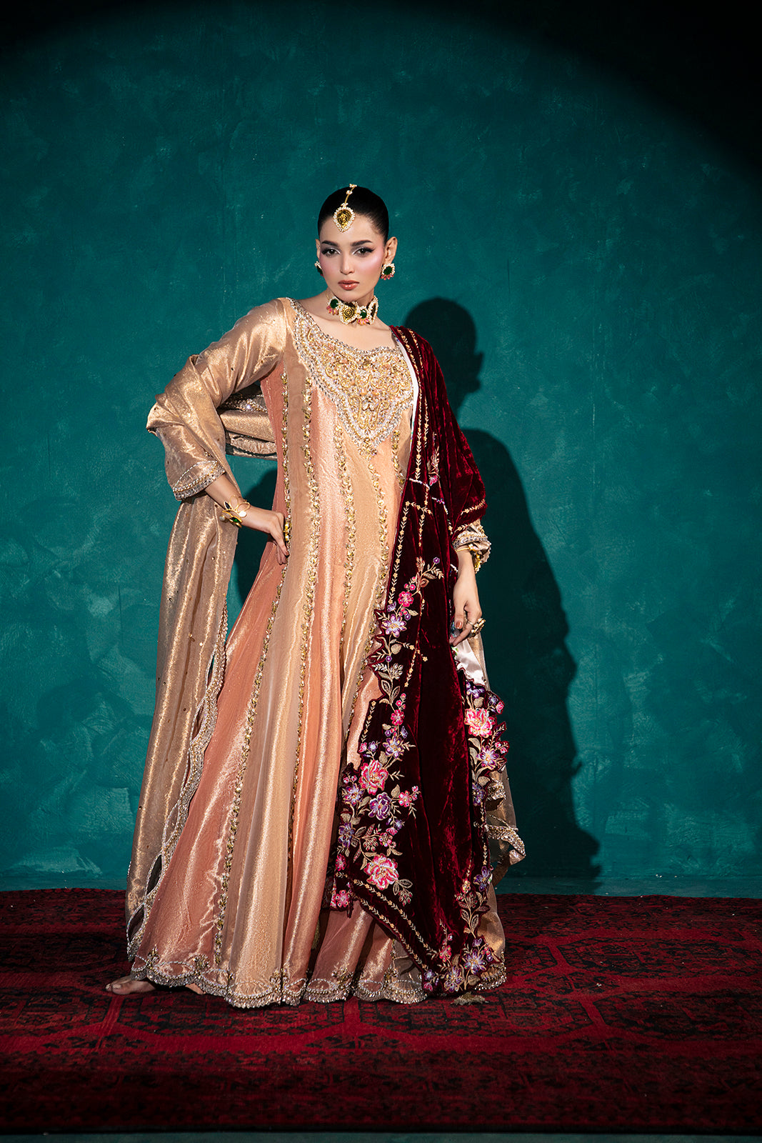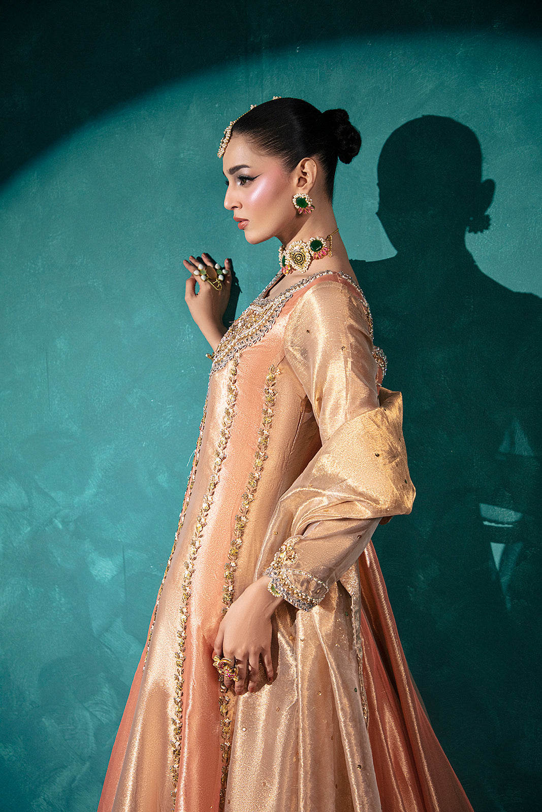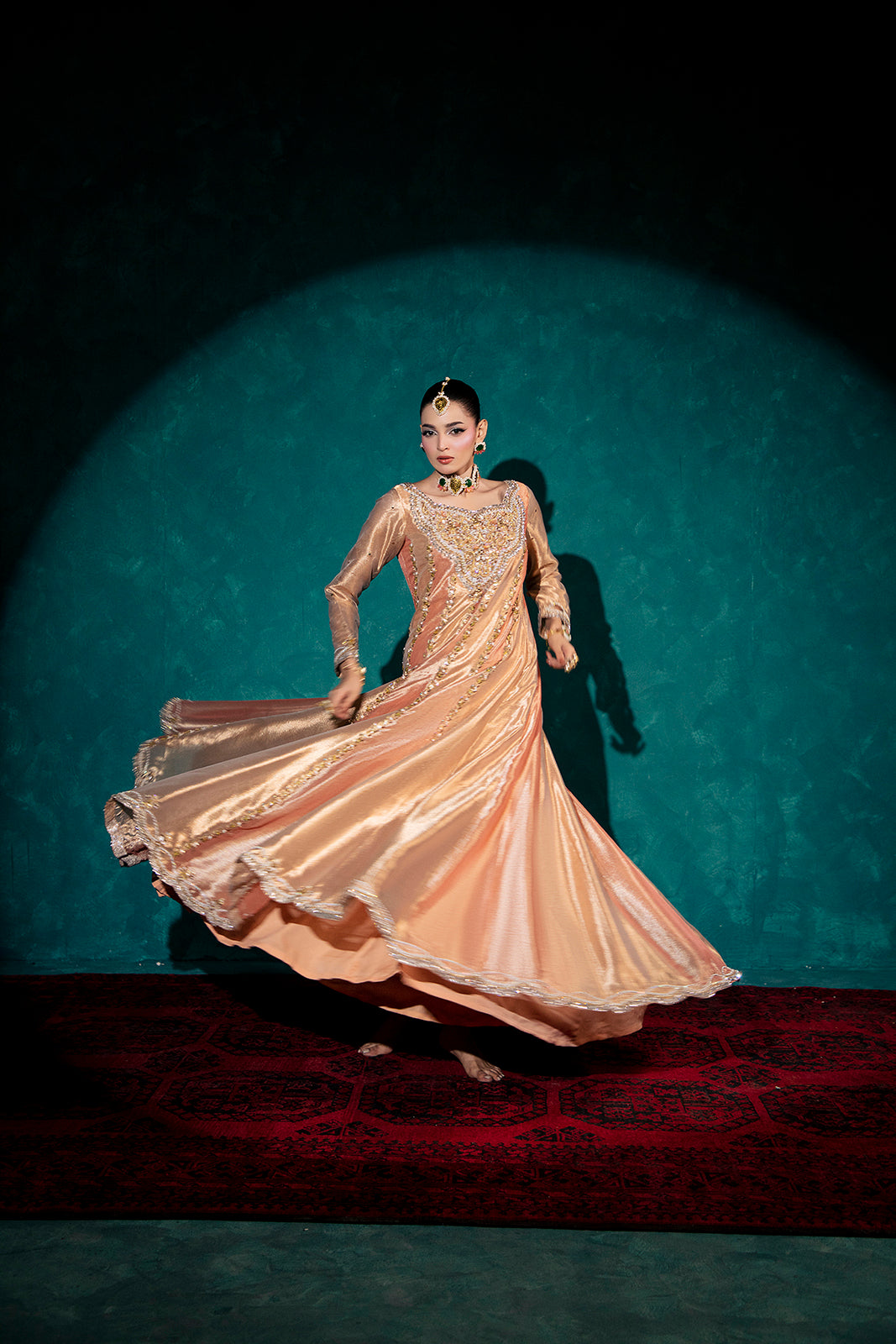 This ethereal shimmer organza kali frock is paired with a matching shimmer organza dupatta. The frock features intricate handwork across the front, sleeves, back neckline, and hem, embellished with crystals, kora, and dabka. The dupatta is finished with a delicately hand-embroidered border, completing this elegant and sophisticated ensemble.