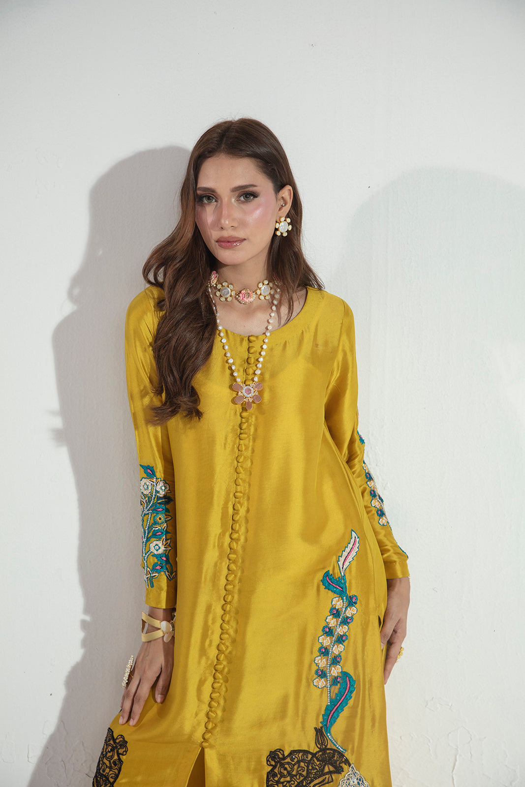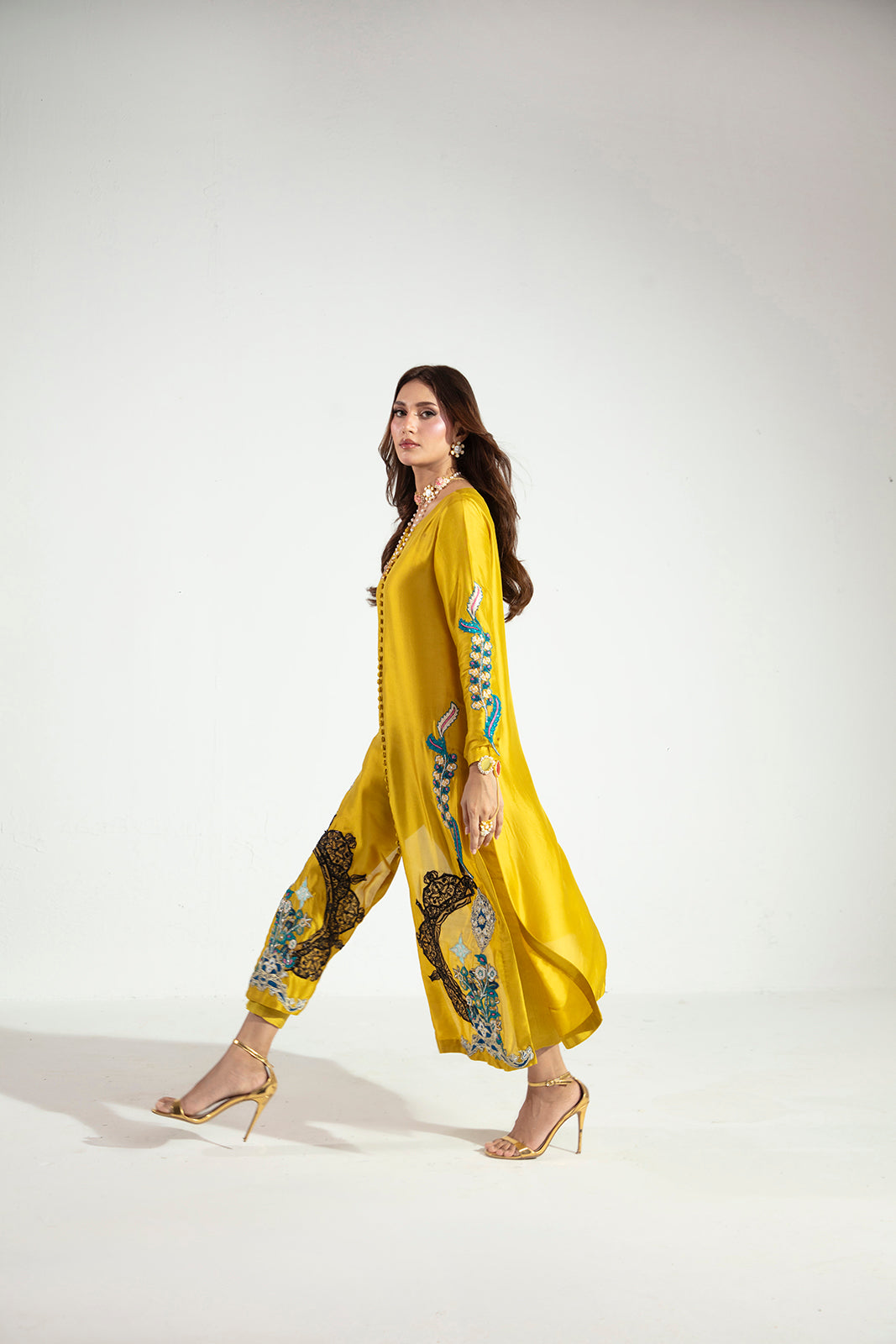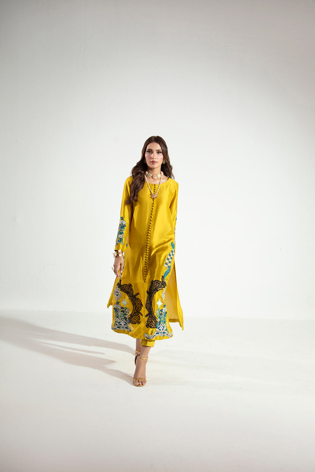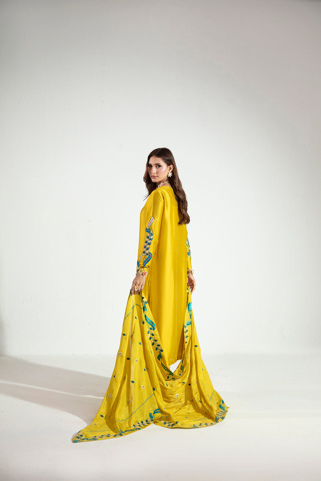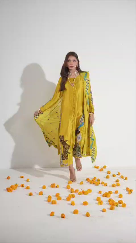 Crafted in pure Sheesha silk, this elegant three-piece ensemble features a beautifully embroidered and hand-embellished shirt paired with sleek raw silk straight pants. The look is completed with a graceful silk dupatta, adding fluidity and refined charm—perfect for elevated festive and formal occasions.