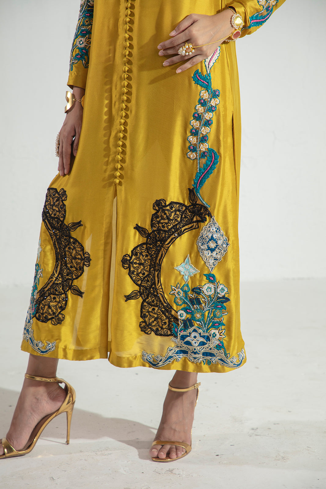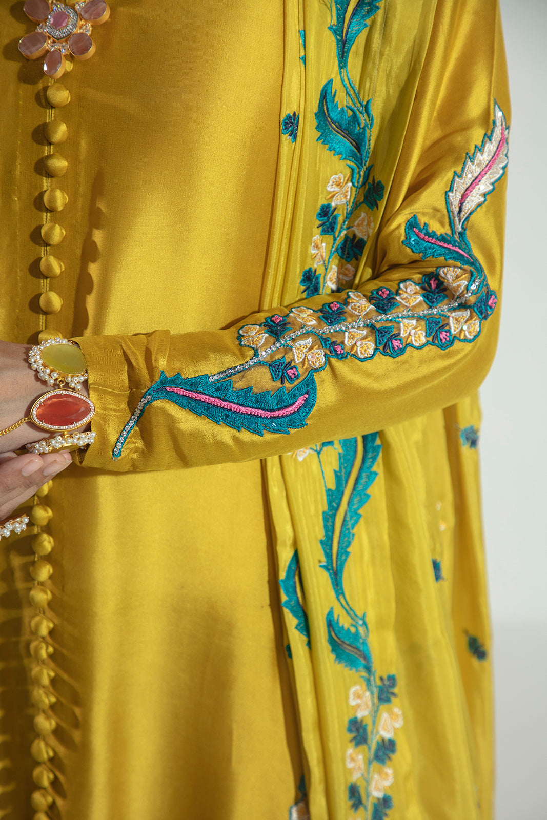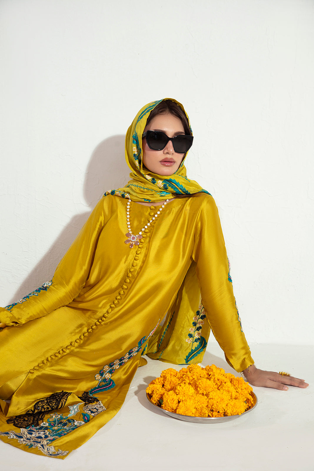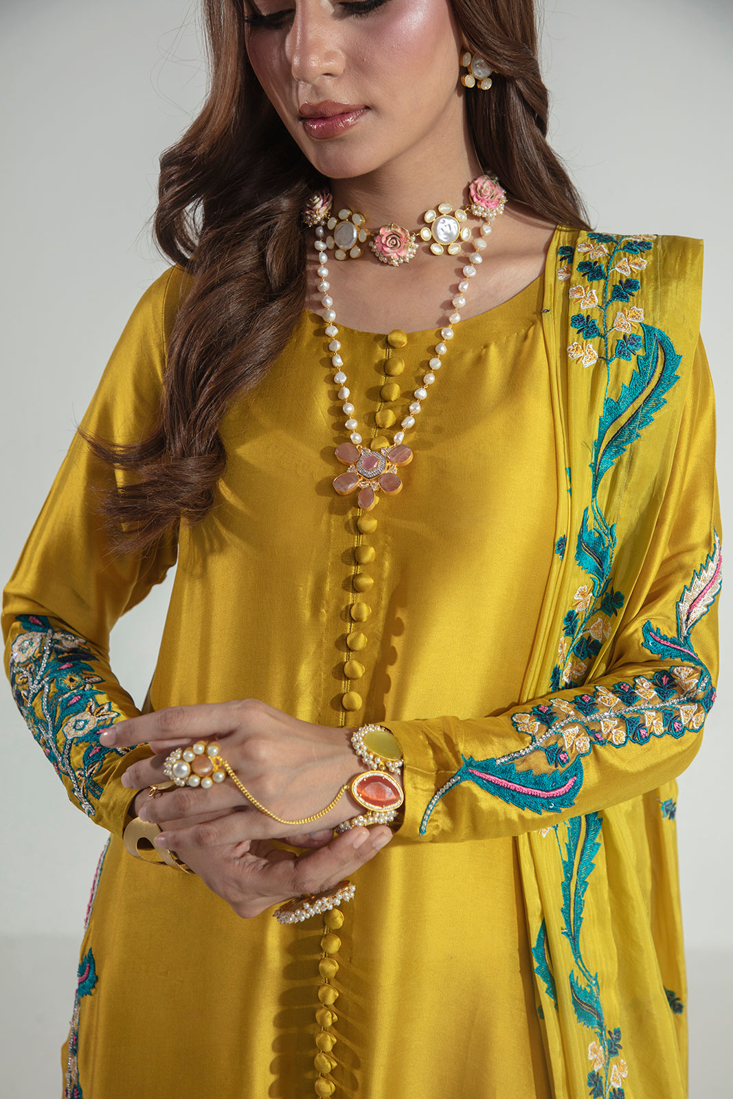 Crafted in pure Sheesha silk, this elegant three-piece ensemble features a beautifully embroidered and hand-embellished shirt paired with sleek raw silk straight pants. The look is completed with a graceful silk dupatta, adding fluidity and refined charm—perfect for elevated festive and formal occasions.