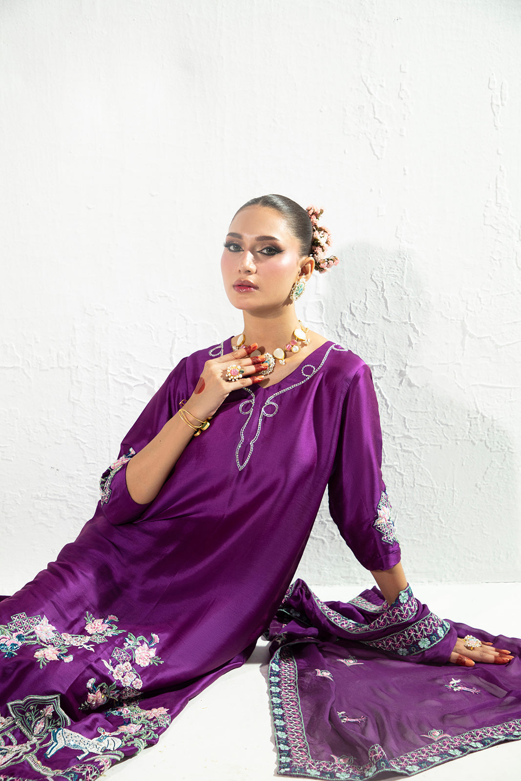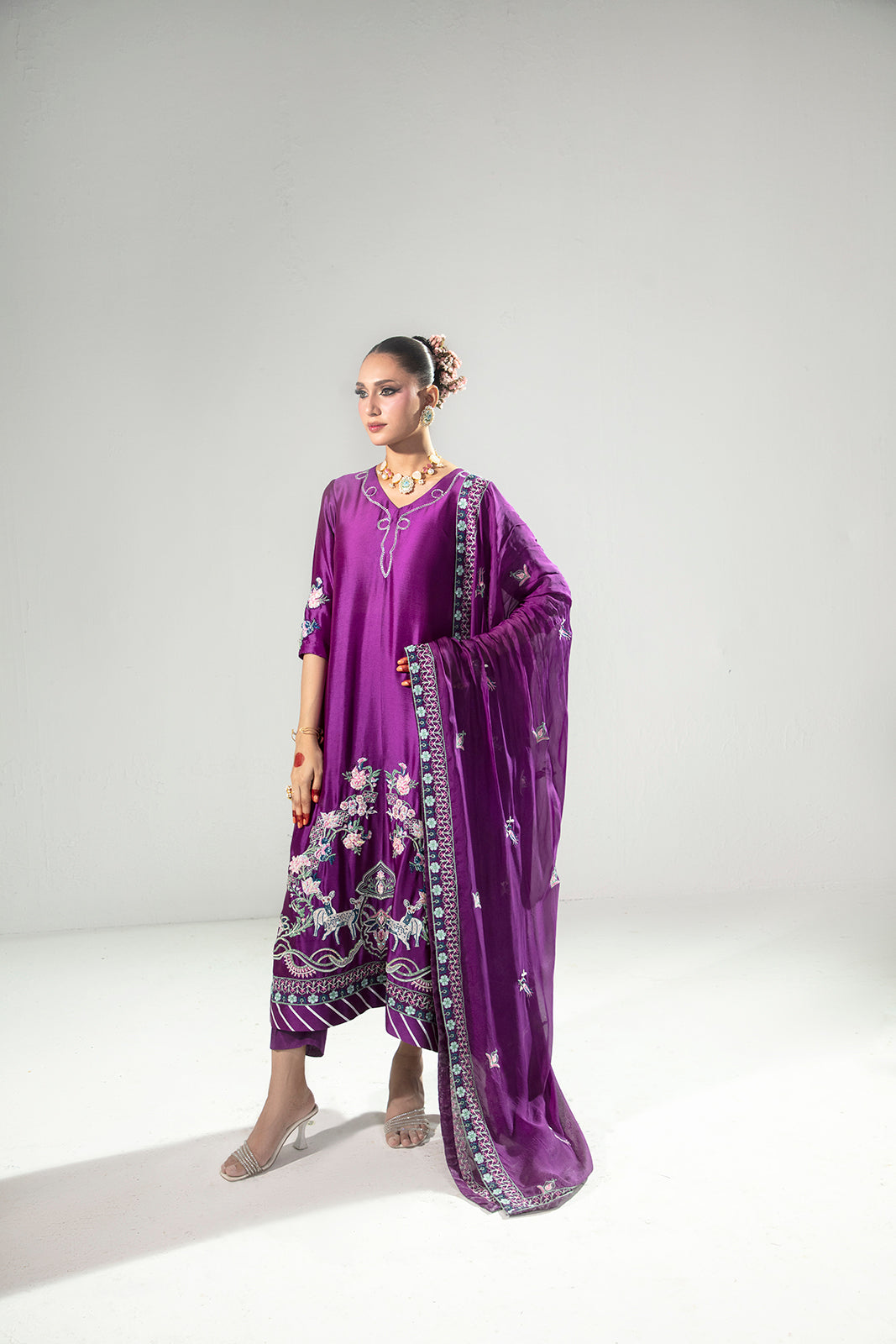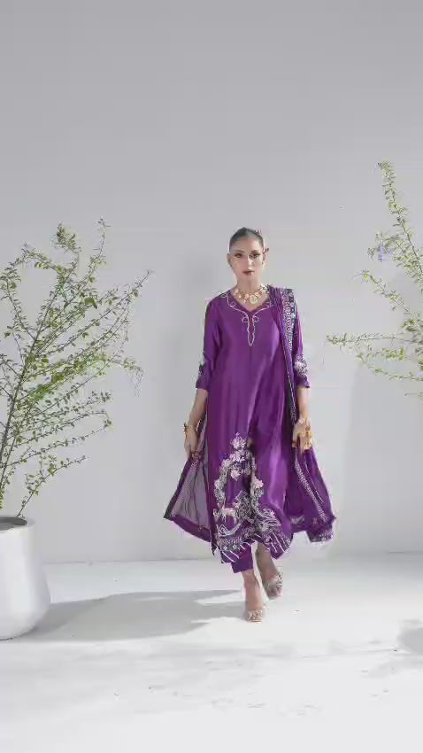 An elegant three-piece ensemble crafted in luxurious Sheesha silk, featuring a beautifully detailed shirt adorned with embroidery and hand embellishments on the sleeves, front neckline, and daman, with a refined embroidered motif at the back. Paired with sleek raw silk pants and a delicately embroidered silk dupatta, this look reflects timeless craftsmanship and understated sophistication.