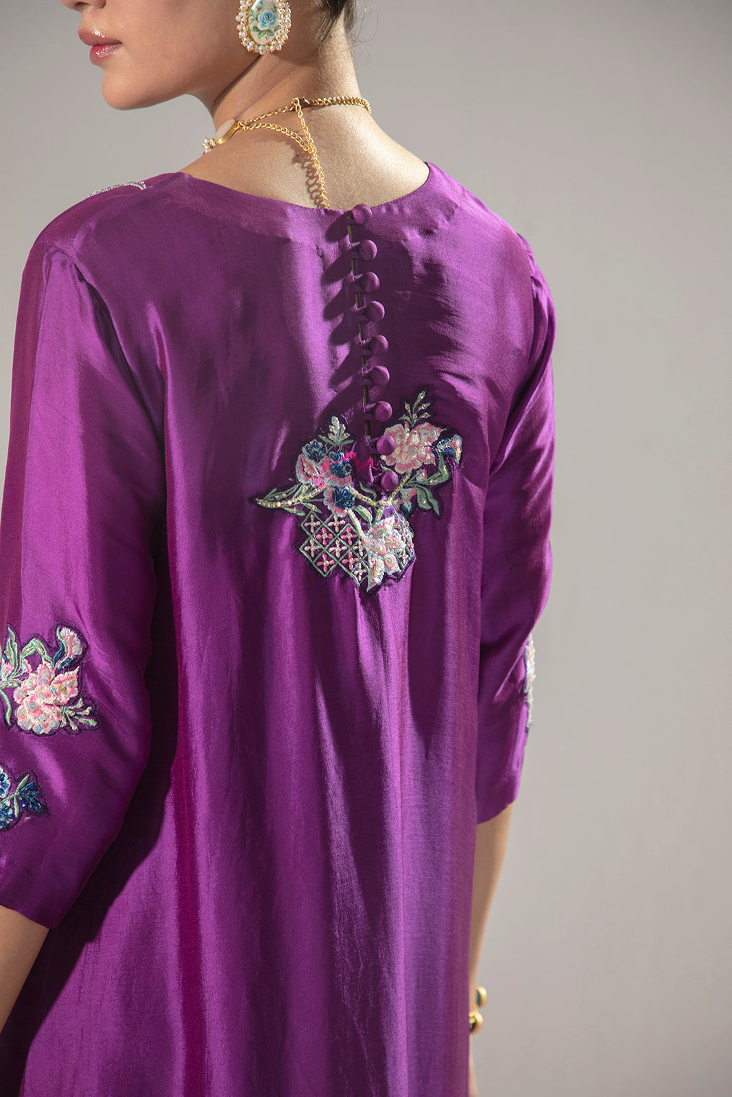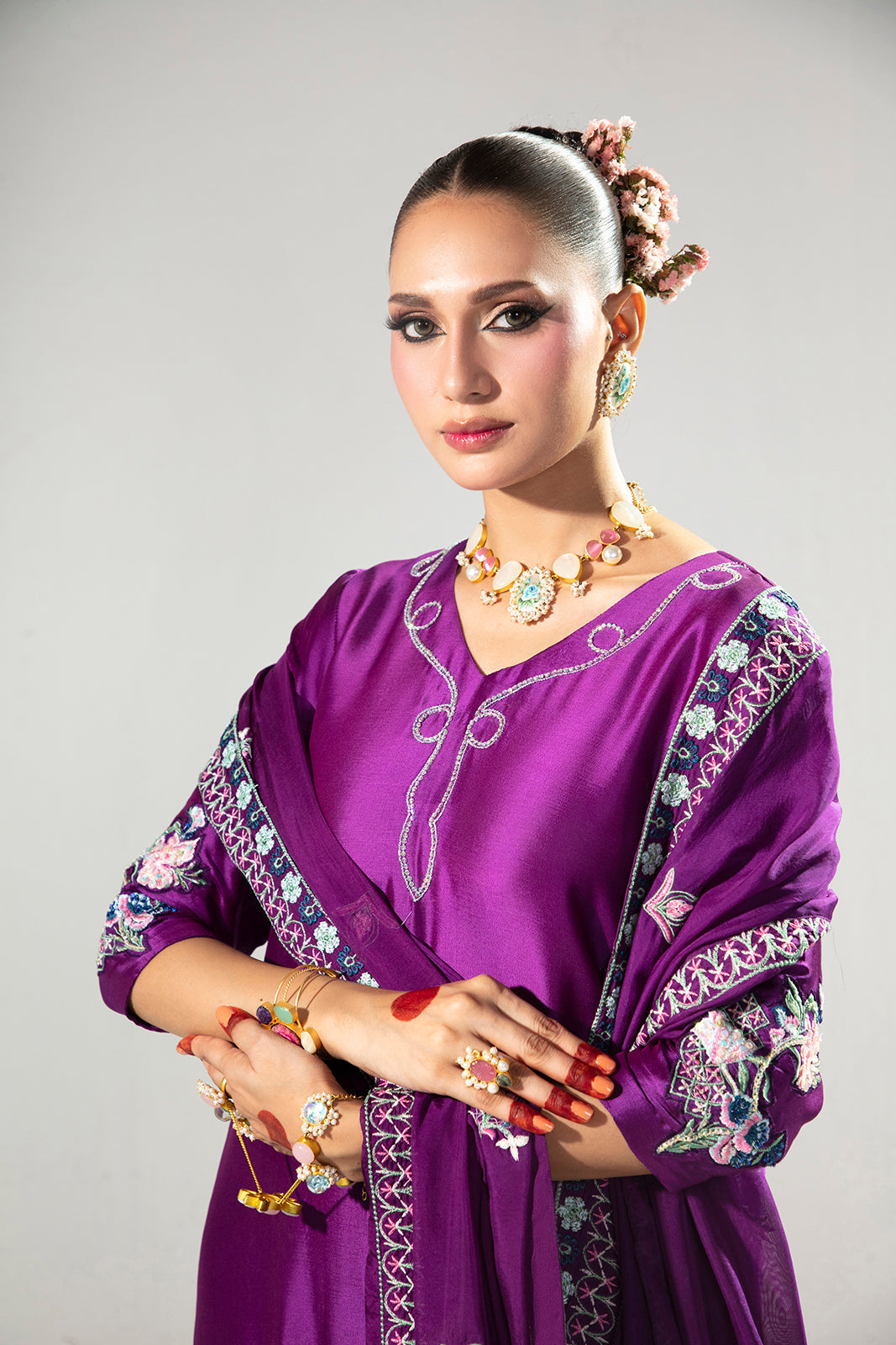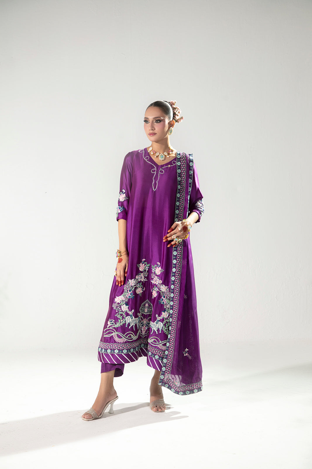 An elegant three-piece ensemble crafted in luxurious Sheesha silk, featuring a beautifully detailed shirt adorned with embroidery and hand embellishments on the sleeves, front neckline, and daman, with a refined embroidered motif at the back. Paired with sleek raw silk pants and a delicately embroidered silk dupatta, this look reflects timeless craftsmanship and understated sophistication.