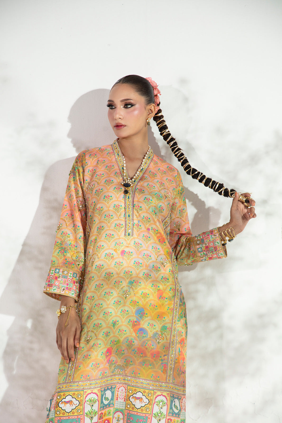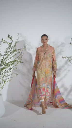 Understated yet refined, this three-piece ensemble captures the essence of effortless elegance. The lawn shirt is hand-embellished on the front and sleeves with gota, sequins, cutdana, and pearls, lending subtle shimmer to its classic silhouette. Paired with a solid off-white cambric trouser and a printed cotton net dupatta, the outfit balances timeless tradition with modern sophistication.