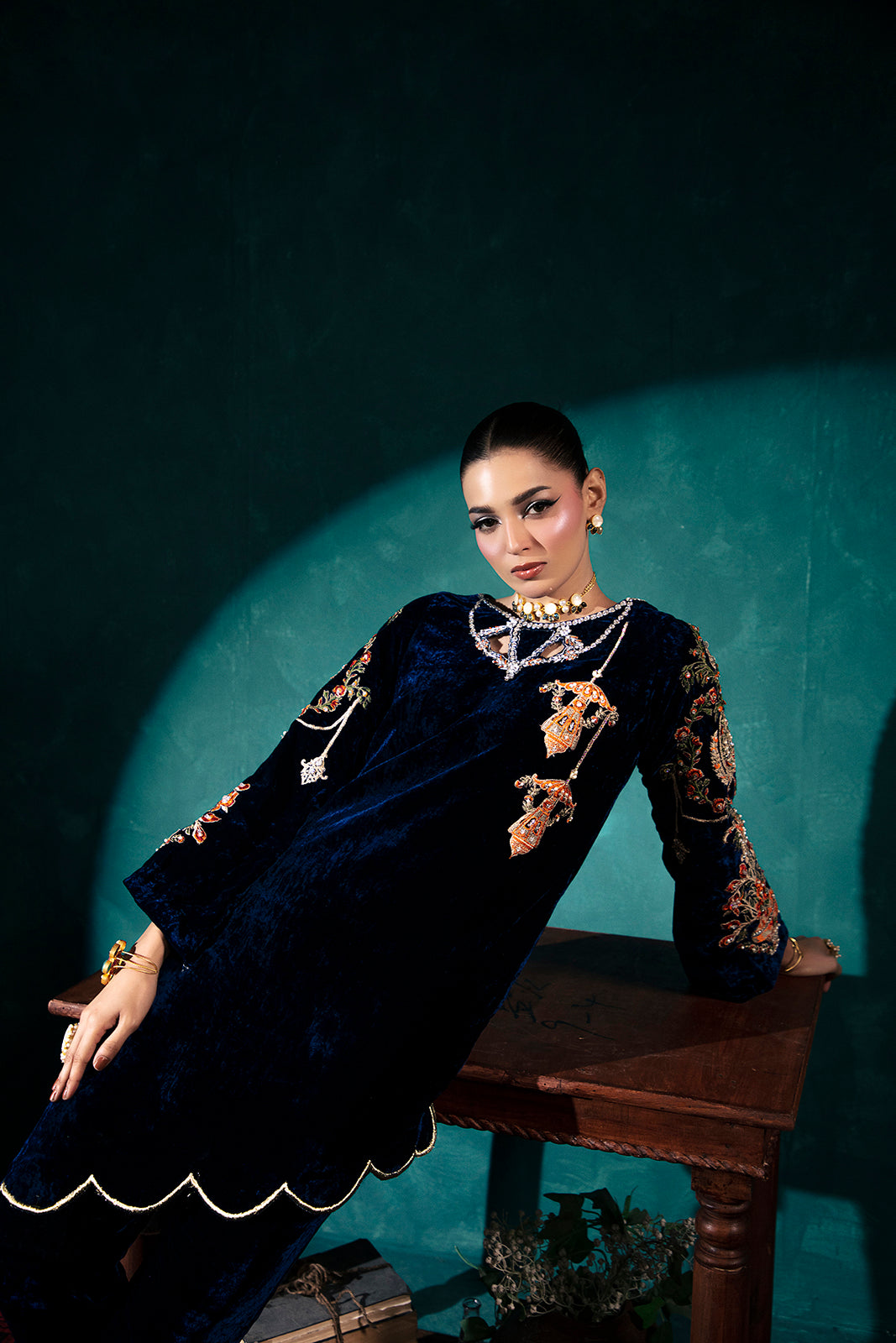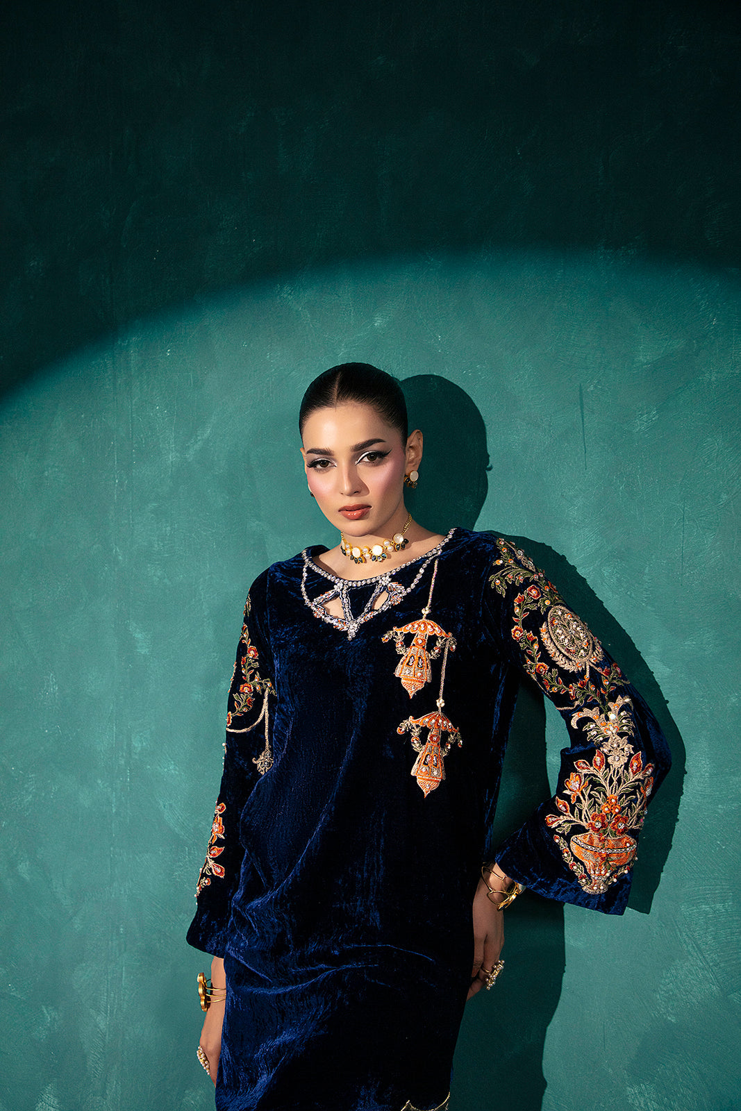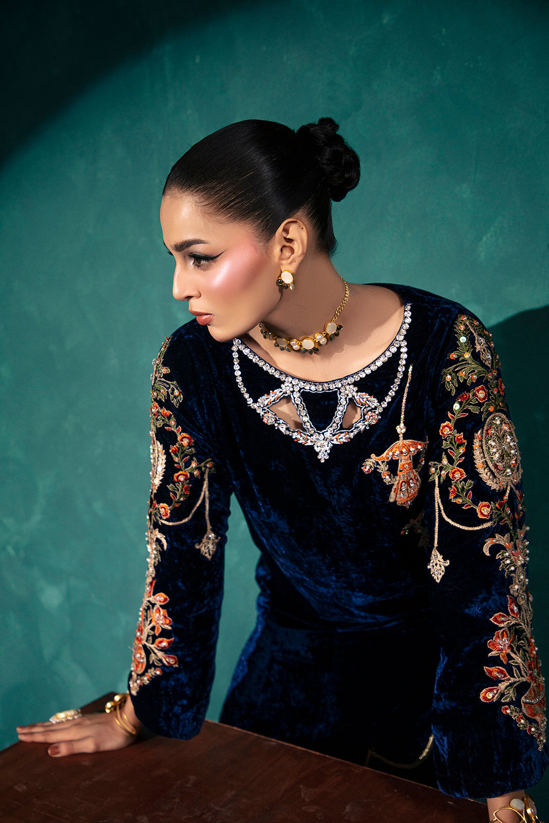 Neckline exquisitely hand-embroidered with crystals, kora, and delicate French knots. Sleeves are meticulously hand-embellished, while the cutwork daman is adorned with intricate tilla work. The back features a beautifully embroidered patch, completing this statement piece with refined artistry.