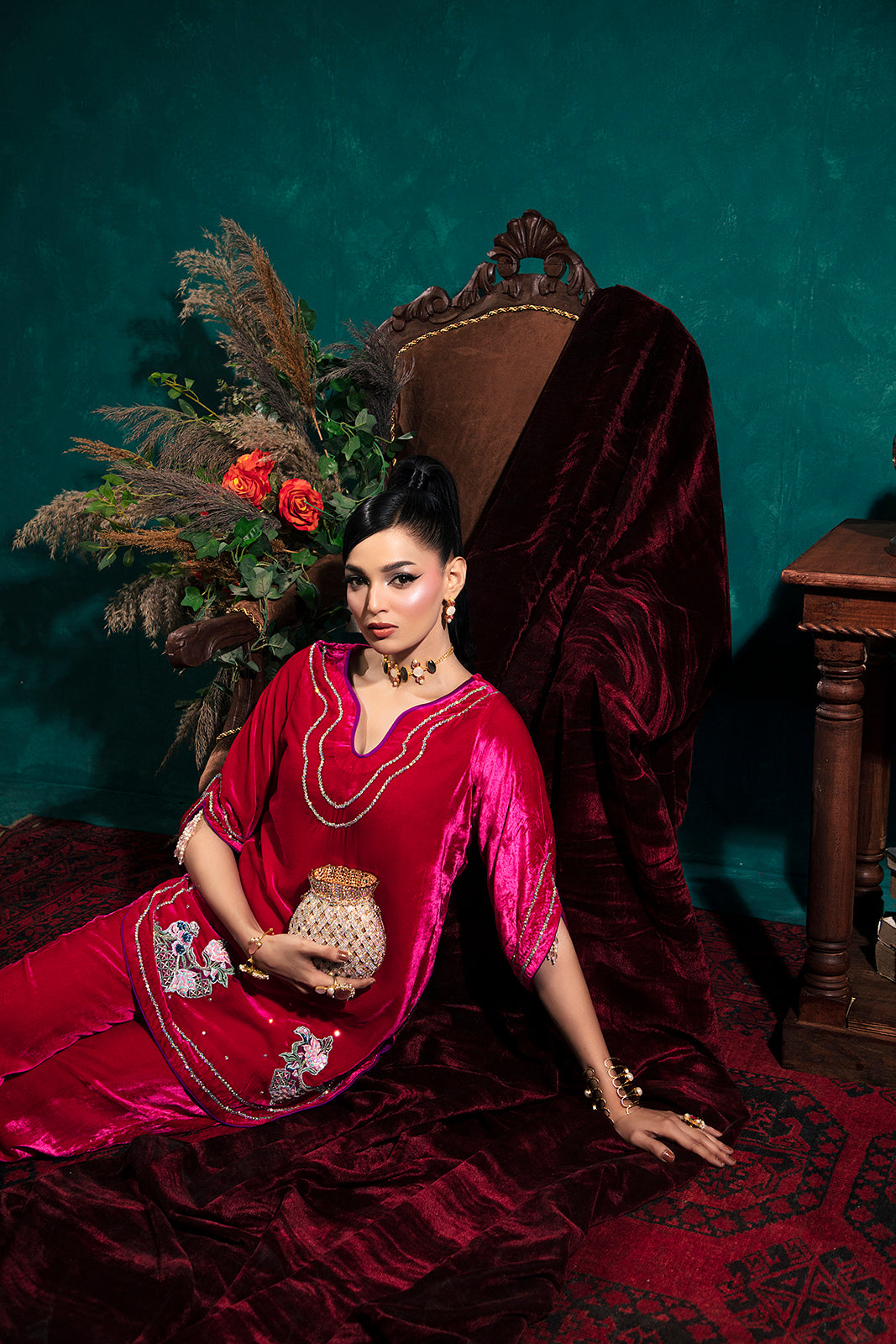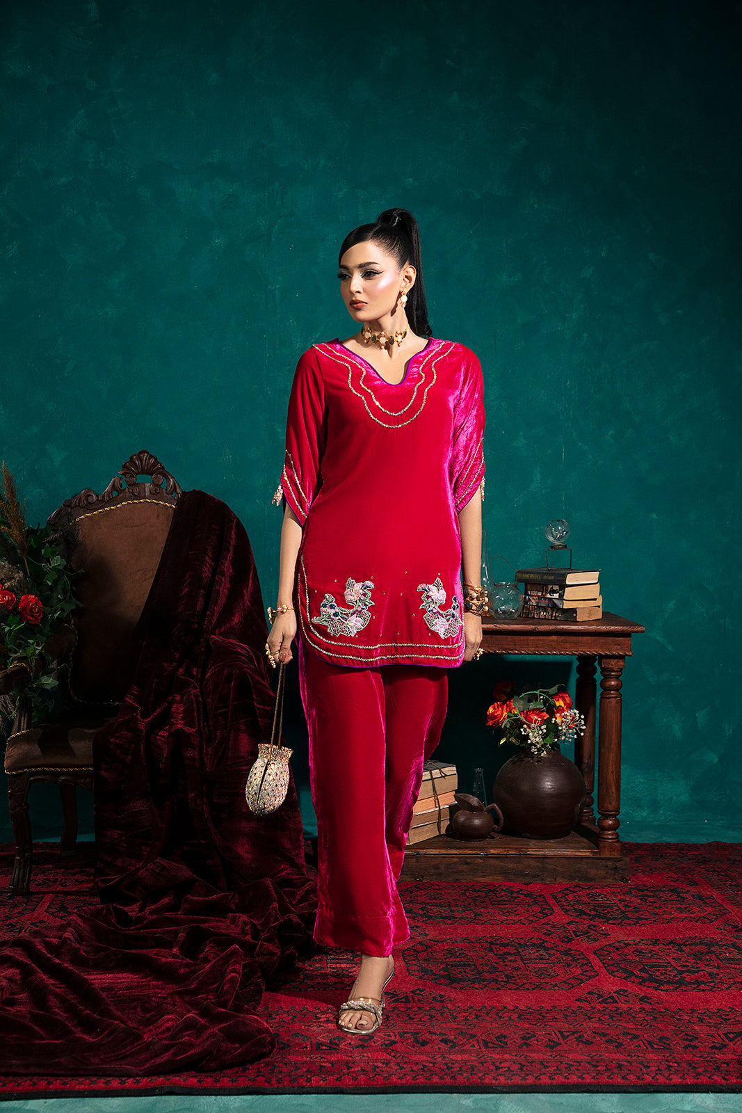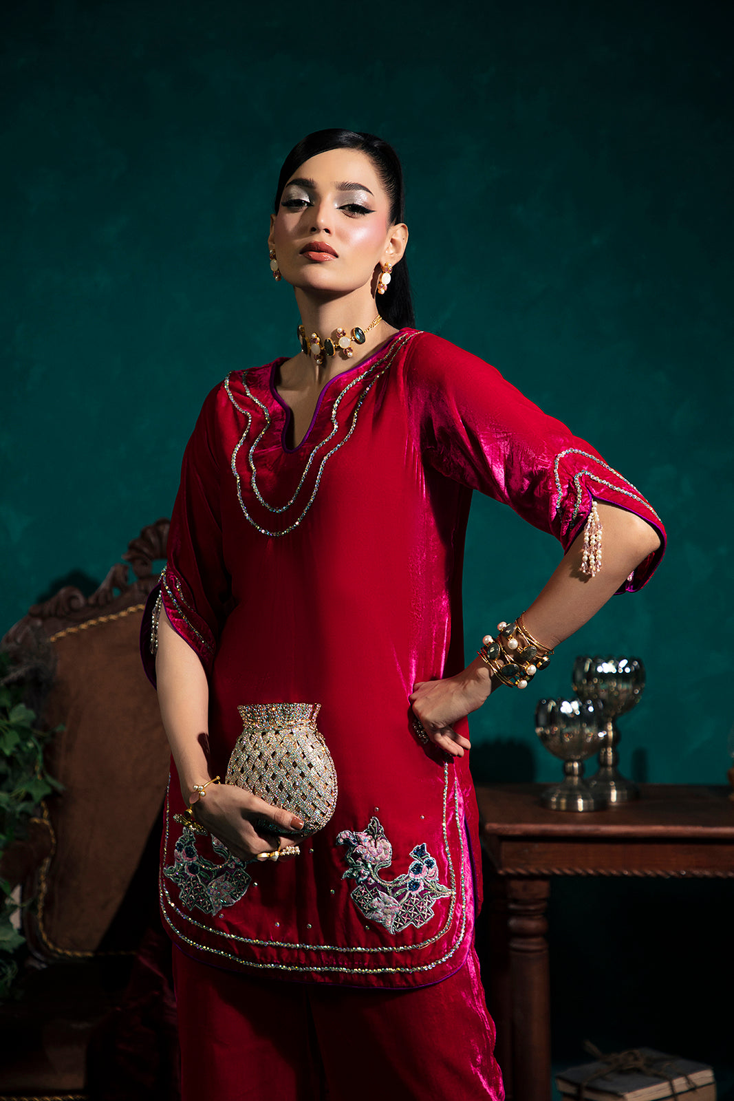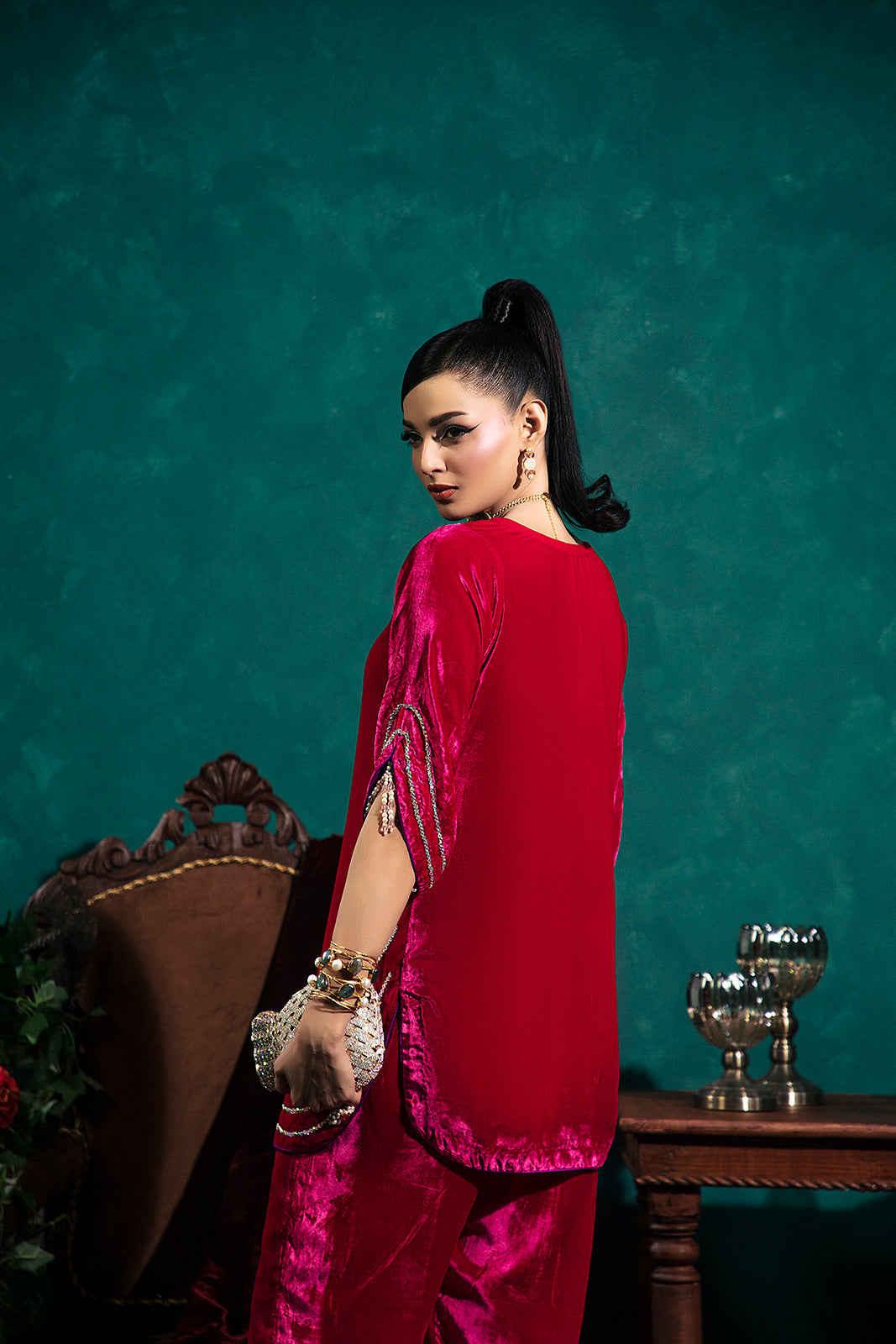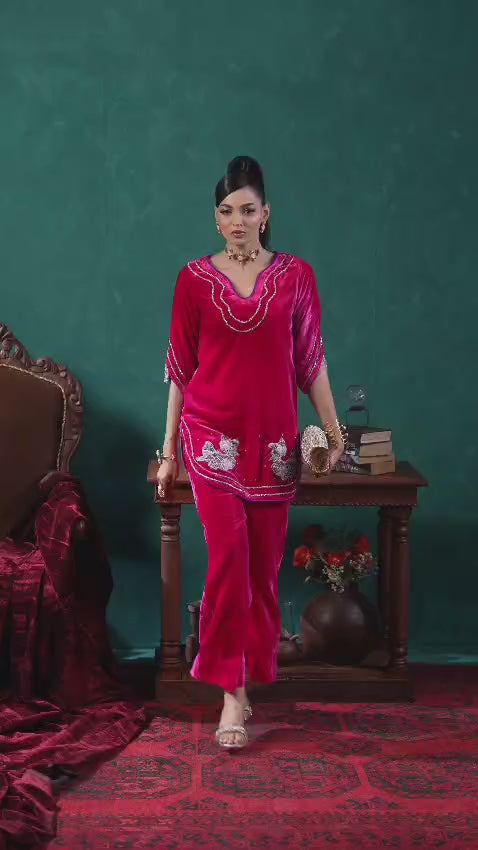 Exquisite cord set featuring sparkling crystal work and intricately hand-embellished motifs, enhanced with sitara, kora, and dabka detailing. The design is finished with a sleek, plain back for understated elegance, asnd paired with matching straight pants to create a refined, cohesive ensemble.